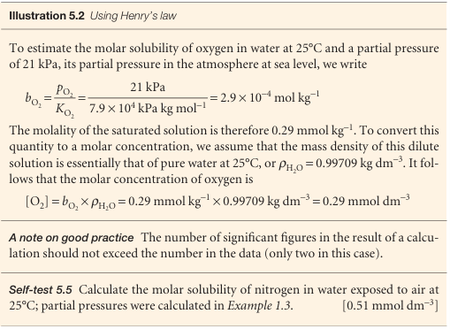 For practical applications, Henry’s law is expressed in terms of the molality, b, of the solute, pB =bBKB Some Henry’s law data for this convention are listed in Table 5.1. As well as providing a link between the mole fraction of solute and its partial pressure, the data in the table may also be used to calculate gas solubilities. A knowledge of Henry’s law constants for gases in blood and fats is important for the discussion of respiration, especially when the partial pressure of oxygen is abnormal, as in diving and mountaineering, and for the discussion of the action of gaseous anaesthetics.