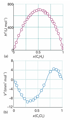 Fig. 5.18 Experimental excess functions at 25°C. (a) HE for benzene/cyclohexane; this graph shows that the mixing is endothermic (because ∆mixH = 0 for an ideal solution). (b) The excess volume, VE, for tetrachloroethene/cyclopentane; this graph shows that there is a contraction at low tetrachloroethane mole fractions, but an expansion at high mole fractions (because ∆mixV = 0 for an ideal mixture).