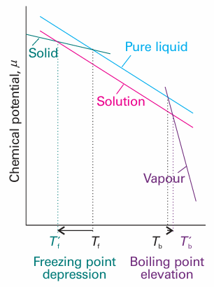 There is no direct influence of the solute on the chemical potential of the solvent vapour and the solid solvent because the solute appears in neither the vapour nor the solid. As can be seen from Fig. 5.21, the reduction in chemical potential of the solvent implies that the liquid–vapour equilibrium occurs at a higher temperature (the boiling point is raised) and the solid–liquid equilibrium occurs at a lower temperature (the freezing point is lowered).