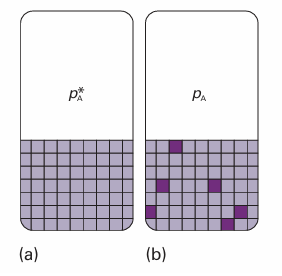Fig. 5.22 The vapour pressure of a pure liquid represents a balance between the increase in disorder arising from vaporization and the decrease in disorder of the surroundings. (a) Here the structure of the liquid is represented highly schematically by the grid of squares. (b) When solute (the dark squares) is present, the disorder of the condensed phase is higher than that of the pure liquid, and there is a decreased tendency to acquire the disorder characteristic of the vapour.