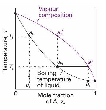 Consider what happens when a liquid of composition a1 is heated. It boils when the temperature reaches T2. Then the liquid has composition a2 (the same as a1) and the vapour (which is present only as a trace) has composition a2 ′. The vapour is richer in the more volatile component A (the component with the lower boiling point). From the location of a2, we can state the vapour’s composition at the boiling point, and from the location of the tie line joining a2 and a2 ′ we can read off the boiling tempera ture (T2) of the original liquid mixture.