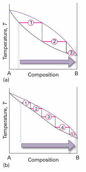 Fig. 6.15 The number of theoretical plates is the number of steps needed to bring about a specified degree of separation of two components in a mixture. The two systems shown correspond to (a) 3, (b) 5 theoretical plates.