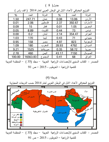 تنتشر حيوانات الابل في الصحراء العربية الافريقية منها والآسيوية ، حيث البيئة الملائمة لتربيتها باعتبارها من الحيوانات التي تتحمل الجوع والعطش والظروف المناخية القاسية والرمال والاتربة والمعروف عنها بأن الله سخرها لهذه البيئة القاسية ، توجد أكثر من (16563.83) الف راس في الوطن العربي لعام 2014 ، وتصدرت الصومال المرتبة الأولى في تربيتها وذلك للمكانة الاجتماعية التي يحظى بها الفرد الصومالي بامتلاكه هذا الحيوان حيث تقدر ثروة الفرد الصومالي والمنزلة الاجتماعية بامتلاكه هذه الأعداد من الجمال ، بلغ عددها (7150) الف رأس وشكلت نسبة قدرها (43.17%) من اعداها في الوطن العربي وبدرجة معيارية قدرها (+ 3.54) ، وتأتي السودان في المرتبة الثانية تليها موريتانيا بالمرتبة الثالثة بأعداد قدرها (7492 ، 1525) الف راس ، وشكلت نسبة قدرها (28.93 ، 9.21%) وبدرجة معيارية ( 2.23 ، 0.41) على التوالي انظر جدول ( 8 ) خريطة ( 4 ) ملحق (2).
