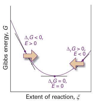 Fig. 7.14 A spontaneous reaction occurs in the direction of decreasing Gibbs energy. When expressed in terms of a cell potential, the spontaneous direction of change can be expressed in terms of the cell emf, E. The reaction is spontaneous as written (from left to right on the illustration) when E>0. The reverse reaction is spontaneous when E<0 When the cell reaction is at equilibrium, the cell potential is zero.