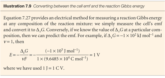 Justification 7.3 The relation between the electromotive force and the reaction Gibbs energy We consider the change in G when the cell reaction advances by an infinitesimal amount dξ at some composition. From eqn 7.15 we can write (at constant temper ature and pressure) , dG=∆rGdξ , The maximum non-expansion (electrical) work that the reaction can do as it advances by dξ at constant temperature and pressure is therefore , dwe =∆rGdξ , This work is infinitesimal, and the composition of the system is virtually constant when it occurs.