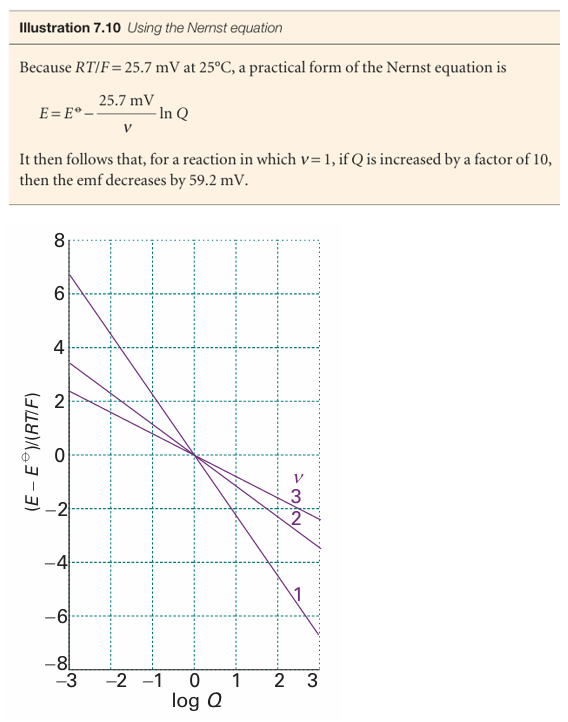 Fig. 7.15 The variation of cell emf with the value of the reaction quotient for the cell reaction for different values of ν (the number of electrons transferred). At 298 K, RT/F =25.69 mV, so the vertical scale refers to multiples of this value.