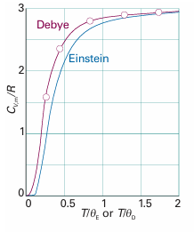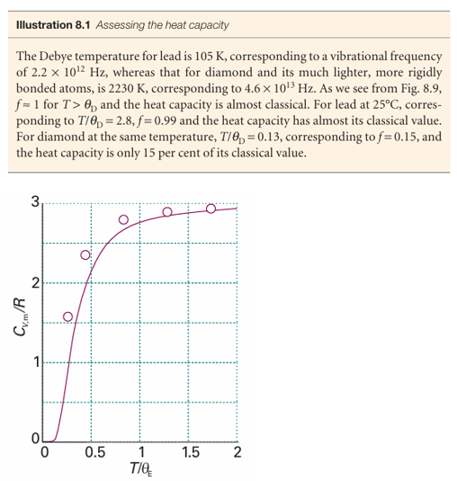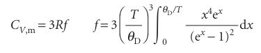 Where θD=hνD/kis the Debye temperature (for a derivation, see Further reading). The integral in eqn 8.9 has to be evaluated numerically, but that is simple with mathematical software. The details of this modification, which, as Fig. 8.9 shows, gives improved agreement with experiment, need not distract us at this stage from the main conclusion, which is that quantization must be introduced in order to explain the thermal properties of solids.