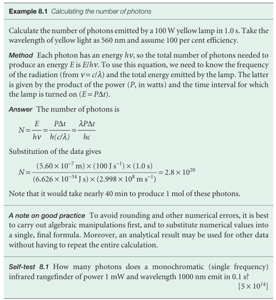 The observation that electromagnetic radiation of frequency ν can possess only the energies 0, hν, 2hν, ... suggests that it can be thought of as consisting of 0, 1, 2, ... particles, each particle having an energy hν. Then, if one of these particles is present, the energy is hν, if two are present the energy is 2hν, and so on. These particles of electromagnetic radiation are now called photons. The observation of discrete spectra from atoms and molecules can be pictured as the atom or molecule generating a photon of energy hν when it discards an energy of magnitude ∆E, with ∆E = hν.
