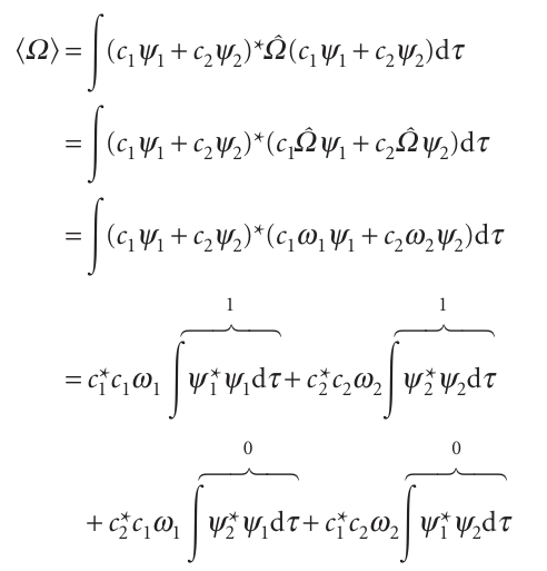 The first two integrals on the right are both equal to 1 because the wavefunctions are individually normalized. Because ψ1 and ψ2 correspond to different eigenvalues of an hermitian operator, they are orthogonal, so the third and fourth integrals on the right are zero. We can conclude that
