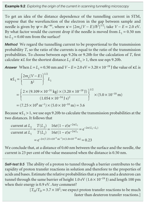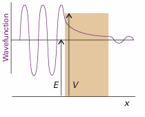 If the potential energy of a particle does not rise to infinity when it is in the walls of the container, and E<v, the wavefunction does not decay abruptly to zero. If the walls are thin (so that the potential energy falls to zero again after a finite distance), then the wavefunction oscillates inside the box, varies smoothly inside the region representing the wall, and oscillates again on the other side of the wall outside the box (Fig. 9.9). Hence the particle might be found on the outside of a container even though according to classical mechanics it has insufficient energy to escape. Such leakage by penetration through a classically forbidden region is called tunnelling. The Schrödinger equation can be used to calculate the probability of tunnelling of a particle of mass mincident on a finite barrier from the left. On the left of the barrier (for x<0)