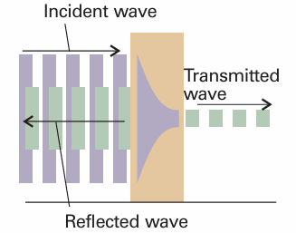Fig. 9.10 When a particle is incident on a barrier from the left, the wavefunction consists of a wave representing linear momentum to the right, a reflected component representing momentum to the left, a varying but not oscillating component inside the barrier, and a (weak) wave representing motion to the right on the far side of the barrier.