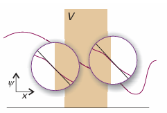 Fig. 9.9A particle incident on a barrier from the left has an oscillating wave function, but inside the barrier there are no oscillations (for E<v). If the barrier is not too thick, the wavefunction is nonzero at its opposite face, and so oscillates begin again there. (Only the real component of the wavefunction is shown.)