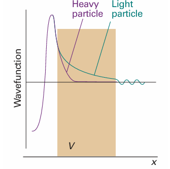 Fig. 9.13 The wavefunction of a heavy particle decays more rapidly inside a barrier than that of a light particle. Consequently, a light particle has a greater probability of tunnelling through the barrier.
