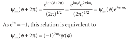 Because we require (−1)2ml = 1, 2ml must be a positive or a negative even integer (including 0), and therefore ml must be an integer: ml = 0, ±1, ±2,....