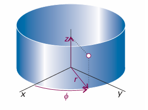 Fig. 9.30 The cylindrical coordinates z, r, and φ for discussing systems with axial (cylindrical) symmetry. For a particle confined to the xy-plane, only r and φ can change.