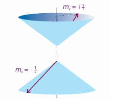 Fig. 10.18 Electrons with paired spins have zero resultant spin angular momentum. They can be represented by two vectors that lie at an indeterminate position on the cones shown here, but wherever one lies on its cone, the other points in the opposite direction; their resultant is zero.