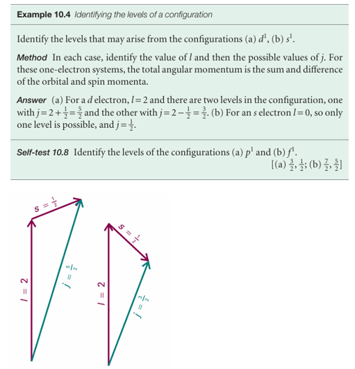 momentum is high; when the two angular momenta are opposed, the total angular momentum is low. The total angular momentum of an electron is described by the quantum numbers j and m j , with j = l + 1/2(when the two angular momenta are in the same direction) or j =l – 1/2(when they are opposed, Fig. 10.28). The different values of j that can arise for a given value of l label levels of a term. For l = 0, the only permitted value is j = 1/2 (the total angular momentum is the same as the spin angular momentum because there is no other source of angular momentum in the atom). When l = 1, j may be either 3/2 (the spin and orbital angular momenta are in the same sense) or 1/2 (the spin and angular momenta are in opposite senses).