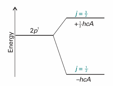 The unpaired electron in the ground state of an alkali metal atom has l = 0, so j = 1–2. Because the orbital angular momentum is zero in this state, the spin–orbit coup ling energy is zero (as is confirmed by setting j = s and l = 0 in eqn 10.41). When the electron is excited to an orbital with l = 1, it has orbital angular momentum and can give rise to a magnetic field that interacts with its spin. In this configuration the electron can have j = 3/2 or j = 1/2, and the energies of these levels are
