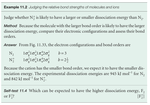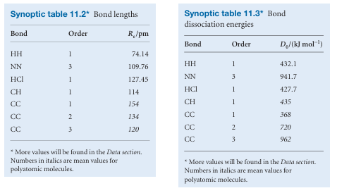 2The greater the bond order, the greater the bond strength. Table 11.2 lists some typical bond lengths in diatomic and polyatomic molecules. The strength of a bond is measured by its bond dissociation energy, De, the energy required to separate the atoms to infinity. Table 11.3 lists some experimental values of dissociation energies.