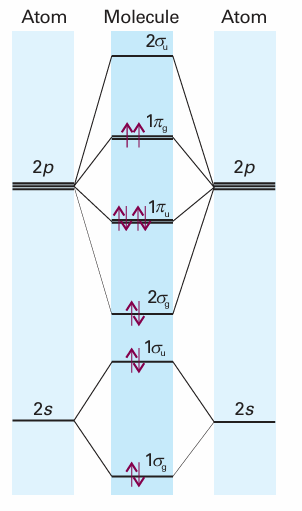 The ground-state electron configuration of O2, with 12 valence electrons, is based on Fig. 11.31, and is 1σg2 1σu2 2σg2 1πu4 1πg2. Its bond order is 2. According to the building-up principle, however, the two 1πg electrons occupy different orbitals: one will enter 1πu, x and the other will enter 1πu, y. Because the electrons are in different orbitals, they will have parallel spins. Therefore, we can predict that an O2 molecule will have a net spin angular momentum S = 1 and, in the language introduced in Section 10.7, be in a triplet state. Because electron spin is the source of a magnetic moment, we can go on to predict that oxygen should be paramagnetic. This prediction, which VB theory does not make, is confirmed by experiment.