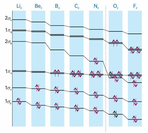 An F2 molecule has two more electrons than an O2molecule. Its configuration is therefore 1σg2 1σu2 2σg2 1πu4 1πg4 and b=1. We conclude that F2 is a singly-bonded molecule, in agreement with its Lewis structure. The hypothetical molecule dineon, Ne2, has two further electrons: its configuration is 1σg 21σu 22σg 21πu 41πg 22σu 2andb=0. The zero-bond order is consistent with the monatomic nature of Ne. The bond order is a useful parameter for discussing the characteristics of bonds, because it correlates with bond length and bond strength. For bonds between atoms of a given pair of elements: