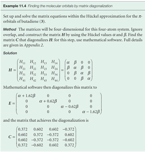 where we have used C−1C=1. In other words, to find the eigenvalues Ei, we have to find a transformation of H that makes it diagonal. This procedure is called matrix diagonalization. The diagonal elements then correspond to the eigenvalues Ei and the columns of the matrix Cthat brings about this diagonalization are the coefficients of the members of the basis set, the set of atomic orbitals used in the calculation, and hence give us the composition of the molecular orbitals. If there are Norbitals in the basis set (there are only two in our example), then there are Neigenvalues Ei and N corresponding column vectors ci. As a result, we have to solve Nequations of the form Hci=SciEi by diagonalization of the N×N matrix H, as directed by eqn 11.46.