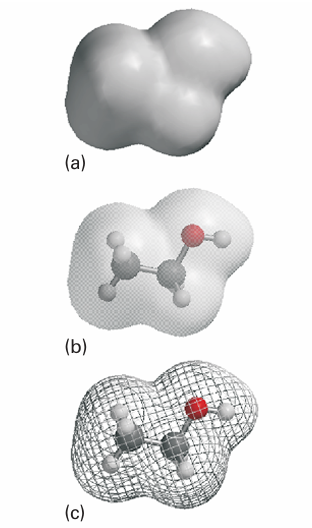Fig. 11.43 Various representations of an isodensity surface of ethanol (a) solid surface, (b) transparent surface, and (c) mesh surface.