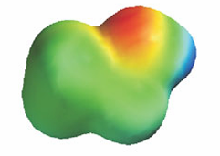 One of the most significant developments in computational chemistry has been the introduction of graphical representations of molecular orbitals and electron densities. The raw output of a molecular structure calculation is a list of the coefficients of the atomic orbitals in each molecular orbital and the energies of these orbitals. The graphical representation of a molecular orbital uses stylized shapes to represent the basis set, and then scales their size to indicate the coefficient in the linear combination. Different signs of the wavefunctions are represented by different colours. Once the coefficients are known, we can build up a representation of the electron density in the molecule by noting which orbitals are occupied and then forming the squares of those orbitals. The total electron density at any point is then the sum of the squares of the wavefunctions evaluated at that point. The outcome is commonly represented by a isodensity surface, a surface of constant total electron density (Fig. 11.43). As shown in the illustration, there are several styles of representing an isodensity sur face, as a solid form, as a transparent form with a ball-and-stick representation of the molecule within, or as a mesh. A related representation is a solvent-accessible surface in which the shape represents the shape of the molecule by imagining a sphere representing a solvent molecule rolling across the surface and plotting the locations of the centre of that sphere. One of the most important aspects of a molecule other than its geometrical shape is the distribution of charge over its surface. The net charge at each point on an isodensity surface can be calculated by subtracting the charge due to the electron density at that point form the charge due to the nuclei: the result is an electrostatic potential sur face (an ‘elpot-surface’) in which net positive charge is shown in one colour and net negative charge is shown in another, with intermediate gradations of colour (Fig. 11.44). Representations such as those we have illustrated are of critical importance in a number of fields. For instance, they may be used to identify an electron-poor region of a molecule that is susceptible to association with or chemical attack by an electron rich region of another molecule. Such considerations are important for assessing the pharmacological activity of potential drugs.