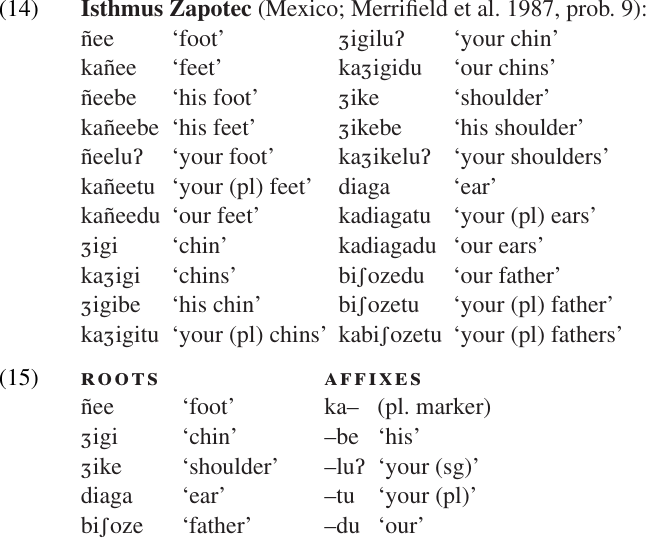The Zapotec data set (including a few additional forms) is reproduced in (14). The meaningful elements that we can identify in this data are listed in (15).