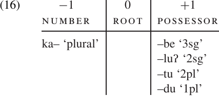 More significant than the position numbers are the labels at the top of each column. In the simplest case, all the elements belonging to a particular position class will have closely related meanings. In this example, all the elements in position+1 identify a possessor in terms of person (first, second, or third) and number (singular or plural). We normally try to assign each position in the chart a label which expresses the grammatical category or function that is shared by all the elements in that position class (in this case, “POSSESSOR”).
