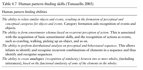 Further research (see Tomasello 2003 for a review) demonstrates that infant pattern-finding skills are not limited to language. Researchers have also found that infants demonstrate the same skills when the experiment is repeated with non-linguistic tone sequences and with visual, as opposed to auditory, sequences. Some of the key features associated with the human pattern-finding ability are summarised in Table 4.7.