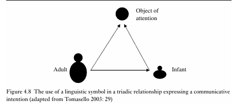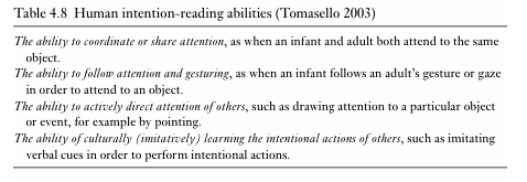 According to Tomasello, the answer lies in the fact that the pattern-finding skills described above are necessary but not sufficient to facilitate language acquisition. In addition, another set of skills are required: intention-reading abilities. While pattern-finding skills allow pre-linguistic infants to begin to identify linguistic units, the use of these units requires intention-reading skills, which transform linguistic stimuli from statistical patterns of sound into fully f ledged linguistic symbols. In other words, this stage involves ‘connecting’ the meaning to the form, which gives rise to the form-meaning pairing that make up our knowledge of language. Only then can these linguistic sounds be used for communication. This process takes place when, at around a year old, infants begin to understand that the people around them are intentional agents: their actions are deliberate and their actions and states can be influenced. The emergence of this understanding allows infants to ‘read’ the intentions of others. Some of the features that emerge from this intention-reading ability are summarised in Table 4.8.