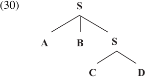 As we will see, many languages allow one clause to be embedded within another (i.e. one S may dominate another). For this reason, in order to determine whether a given clause contains the “right number” of complements, we need to be more precise about what it means for two elements to belong to the same clause. We will say that two elements are CLAUSE-MATES if the smallest clause that contains either one of them contains the other as well. To restate this definition in terms of tree structure, we say that X and Y are clause-mates if the smallest S which dominates X also dominates Y, and vice versa. For example, A and B are clause-mates in (30), as are C and D. But A and C are not clause-mates, and neither are A and D, B and C, or B and D.