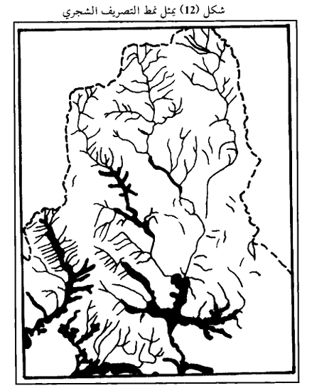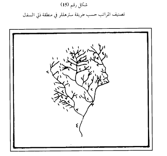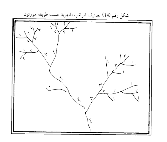 فمثلاً إذا كانت نسبة التشعب ( ش ن) تساوي 3 والمجرى الرئيسي من الرتبة السادسة فإن عدد المجاري المائية ستكون كالتالي ( 1ـ 3 ـ 9 - 27 - 81 - 243 ) أي على شكل متوالية هندسية أي كل رقم يتزايد بمقدار ثلاثة أمثال العدد الذي يسبقه وعلى هذا الأساس يمكن القول أن العلاقة بين المرتبة وعدد مجاريها يتبع متوالية هندسية تتوافق مع النموذج الحسابي الذي يعرف بالمعادلة الأسية السالبة. انظر الشكل رقم (14).