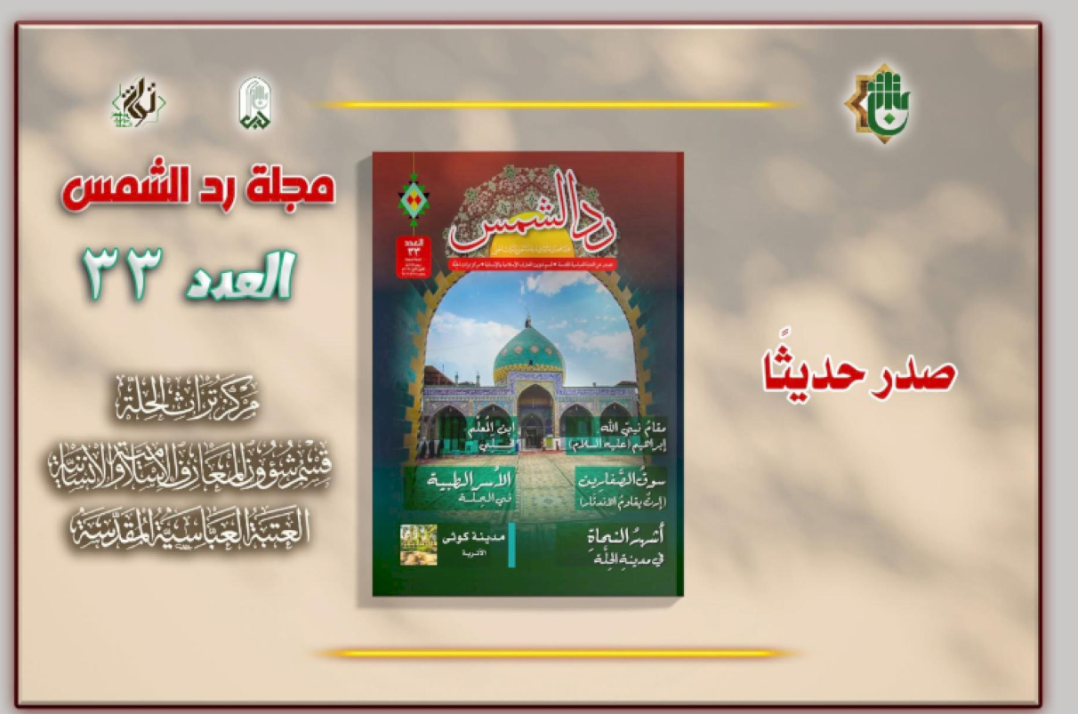 أصدر قسمُ شؤون المعارف الإسلامية والإنسانية في العتبة العبّاسية المقدّسة، العددَ الثالث والثلاثين من مجلة (ردّ الشمس) الفصلية. ويُشرف على إصدار المجلّة مركزُ تراث الحلّة التابع للقسم، وتُعنى بالتراث الحلّي وتوثيق محطّاته الفكرية والثقافية. ويأتي العدد استمرارًا لنهج المجلة في تسليط الضوء على الإرث الحضاري والفكري الغني، الذي تتميّز به مدينةُ الحلّة، إذ اشتمل على مجموعةٍ من المواد المتنوّعة في مجالات التاريخ، والأدب، والتراث والفكر، أعدّها نخبةٌ من الباحثين والكتّاب المختصّين. وجاء هذا العدد حافلًا بملفّاتٍ وبحوث ودراسات تتناول محطّاتٍ مهمّة من تاريخ الحِلّة ومعالمها الدينية والاجتماعية والثقافية، إذ خُصِّص باب المراقد والمزارات للحديث عن مقام نبيّ الله إبراهيم(عليه السلام)، متناولًا أبعاده الدينية وأثره في الوجدان المحلّي والذاكرة التاريخية للمدينة، وتناول باب (معالم حلّية) سوق الصفّارين بوصفه أحد الشواهد الحيّة على الحِرَف التقليدية؛ مستعرضًا تاريخه العريق ودوره في الحياة الاقتصادية، وما يواجهه من تحدّياتٍ في سبيل الحفاظ عليه وصموده أمام مظاهر الاندثار، أمّا باب (محطات حلّية)، فقد توقّف عند مرحلةٍ مفصلية من تاريخ المدينة، عبر بحثٍ وثائقي عن واقع التعليم في الحِلّة إبّان مدة الاحتلال البريطاني؛ موثِّقًا طبيعة المؤسّسات التعليمية آنذاك والتحدّيات التي رافقت نشأتها وتطوّرها.