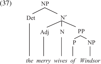 If we assume that only constituents can be replaced by a pronominal element, the examples in (34) suggest that adjective modifiers form a constituent with the noun that they modify. This constituent is commonly labeled N’ (pronounced “N-bar”). A similar pattern seems to emerge with PP complements: