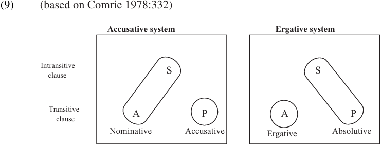 The accusative and ergative patterns are compared in (9), using “S” for the subject of an intransitive clause, “A” (Agent) for the subject of a transitive clause, and “P” (Patient) for the object of a transitive clause. As this diagram illustrates, the defining characteristic of the ergative pattern is a unique case marker for transitive subjects, while the defining characteristic of the accusative pattern is a unique case marker for transitive objects.