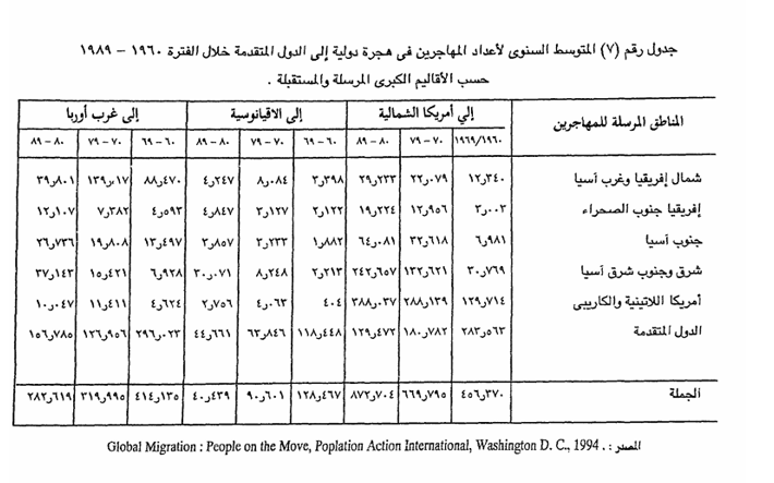 ويتضح من أرقام الجدول (7) أنه بينما تأخذ الهجرة الدولية إلى أمريكا الشمالية اتجاها نحو الزيادة خلال الثلاثين عاما الماضية فإن هذه الأعداد تتناقص إلى كل من الاقيانوسية وغرب أوروبا ، كما يظهر اتجاه آخر وهو أن معظم الهجرات إلى الدول المتقدمة تحدث من دول أخرى متقدمة ، أو بعبارة أخرى من دول متقدمة إلى دول أخرى أكثر تقدما ، وذلك بحثا عن الفرص الأفضل فى الحياة ، والإسهام في صناعة التقدم .