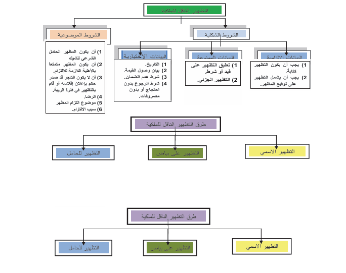 ث- شرط الرجوع بدون احتجاج أو بدون مصاريف، فقد يضع المظهر شرط إعفاء الحامل من عمل الاحتجاج، وذلك بكتابة عبارة بدون احتجاج أو بدون مصاريف على ورقة الشيك مع التوقيع على ذلك، والهدف من هذا الشرط هو إعفاء الحامل من المصاريف الناجمة عن عمل الاحتجاج، ويقتصر أثر هذا الشرط على المظهر الذي وضعه فقط. ونظراً لتشعب الموضوعات المتعلقة بالتظهير الناقل للملكية في الشيك، فقد رأينا من الملائم عرضها وفق الرسم التخطيطي التالي تسهيلاً لاستيعابها.