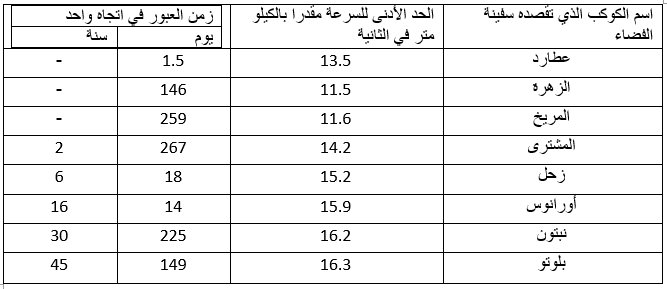 أينا أن السرعة المبدئية للانطلاق من الأرض إلى الكواكب الأخرى تتوقف على الطريق الذي نتخذه في سفرنا، ورأينا كذلك أن الناحيـــة المسار شبه القطع الناقص هو أفضل المسارات من كي نصل إلى الاقتصادية. إذن ما هو الحد الأدنى للسرعة المطلوبة الكواكب الأخرى من المجموعة الشمسية. وكم تستغرق منا هذه الرحلة الإجابة عن هذه الأسئلة مبينة بالجدول الآتي
