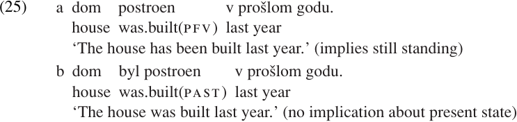 The use of the perfect form in the Russian example (25a) implies that the state of affairs brought about by the described event continues to be true at the present moment: the house is still standing. The use of the simple past in the same context (25b) does not carry any such implication: the house may or may not be standing (Comrie 1976a:54).