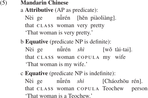 In the latter case, the meaning of the equative clause is very much like that of an attributive clause; compare the equative clause in (4c) with the attributive clause in (4d). But the grammatical structure of an equative clause is normally the same whether the predicate NP is definite or indefinite. In Mandarin Chinese, for example, no copula is used for attributive clauses (those with AP predicates), as illustrated in (5a). However, a copula (linking verb) is used for equative clauses, whether the predicate NP is definite (5b) or indefinite (5c). (The predicate phrase is enclosed in brackets in these examples.)