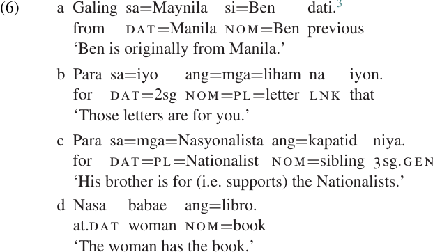 A clause like (3c), in which the semantic predicate is expressed by a prepositional phrase, is often referred to as a LOCATIVE CLAUSE. As this name suggests, clauses of this type are often used to identify the location of the subject, as in (3c). However, this construction can also be used to express a wide range of other semantic functions; some of these are illustrated in the Tagalog examples in (6).