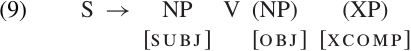 We will use the annotation XCOMP to designate the Grammatical Relation of a predicate complement. The “X” stands for any major category (N, A, V, or P), reflecting the fact that predicate complements may be NPs, APs, PPs, or even VPs (though we will not discuss VP complements here). We can represent the structure of an English sentence containing a predicate complement with a rule like (9), where XP stands for any phrasal category (NP, AP, PP, or VP). Notice that this single rule will account for the sentences in (7), which contain a copula, as well as those in (8), which contain other verbs.