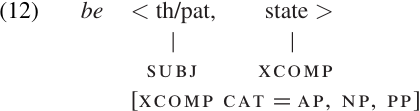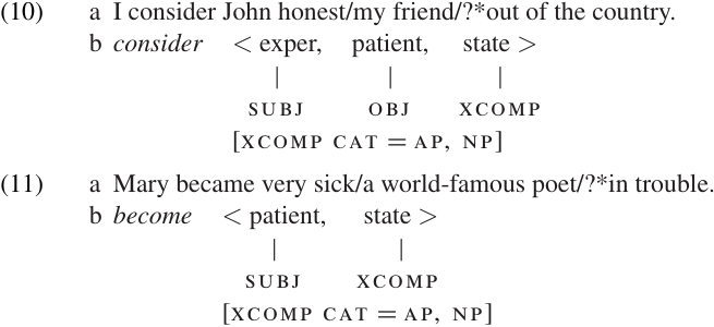 The lexical entries for the verbs in (8), and for the copula, must include a predicate complement as part of the verb’s subcategorization. The problem of specifying the category (NP, AP, or PP) of the predicate complements which can occur with a particular English verb is somewhat complex.1 For simplicity, we will assume that the lexical entry for each verb specifies the possible categories of its XCOMPs. As predicted by the rule in (9), no verb takes more than one predicate complement in the same clause, regardless of category. Possible lexical entries for the verbs consider and become are proposed in (10–11).