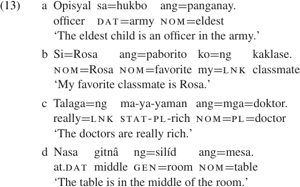 As we saw in (3), attributive, equative, and locative clauses in Tagalog do not contain a copula. Some slightly more complex examples are given in (13). (13a) shows an equative clause with an indefinite predicate NP; (13b) shows an equative clause with a definite predicate NP; (13c) shows an attributive clause with a complex AP as predicate; and (13d) shows a locative clause.1