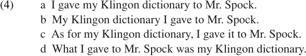 All four of these sentences contain the same propositional meaning; that is, they all describe the same basic event and would be true under the same circumstances. However, they would not normally be spoken in the same contexts or for the same purposes. Sentence (4d) seems to assume that we already know that SOMETHING was given to Mr. Spock; the question is WHAT? The crucial piece of new information provided by this sentence (i.e. the FOCUS of the sentence) is the Klingon dictionary. Sentences (4b, c) also assign special prominence to the Klingon dictionary, this time as TOPIC (what the sentence is about). The act of giving in these sentences is new information, and not presupposed as in (4d). Sentence (4a), which follows the basic, normal, rules of English word order, does not assign special prominence to any particular constituent; it simply describes the event in a relatively “neutral” way.