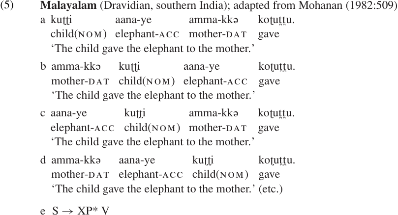 In some languages, however, it may not be possible to determine a “basic” word order. Mohanan (1982) states that in Malayalam any permutation of the constituents in a clause is allowed, as illustrated in (5), provided that the verb occurs in final position. Further, these variations in word order make no significant difference in the semantics or intonation of the sentence. Mohanan argues that Malayalam clause structure is best described by the PS rule in (5e), which says that a clause consists of an arbitrary number of phrasal constituents followed by the verb. In this language, word order is so free that there seems to be little point in identifying one particular order as being more basic than the others.