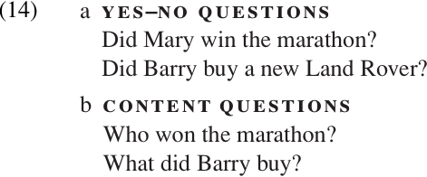 Two basic types of questions are found in virtually all languages: (a) YES–NO QUESTIONS; and (b) CONTENT QUESTIONS.1 The difference is illustrated in (14):