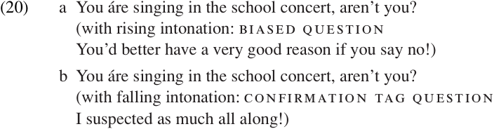 Biased questions are distinguished from confirmation tags in English primarily by intonation. If the examples in (19) are read with final falling intonation, they have the force of normal confirmation tag questions. If the same sentences are read with final rising intonation, they have the force of biased questions. Also, marked focal stress on the first auxiliary element, as in (20), is more common in biased questions. With confirmation tag questions(20b), this kind of stress pattern may convey a sense of newly discovered and surprising information.